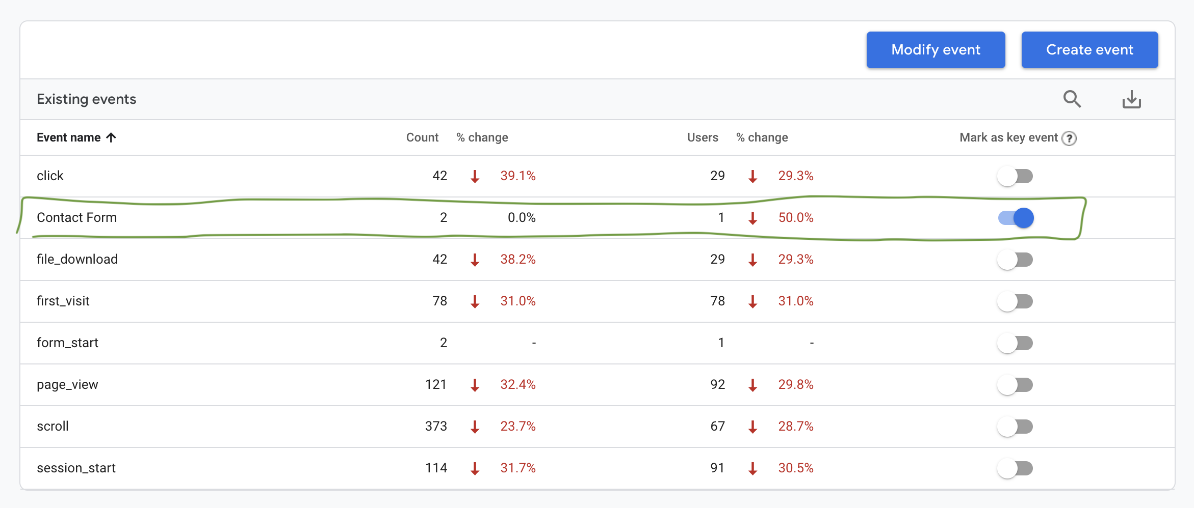 Then, toggle the Contact Form event to "Mark as key event" - see screenshot below:
